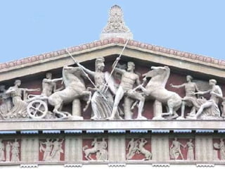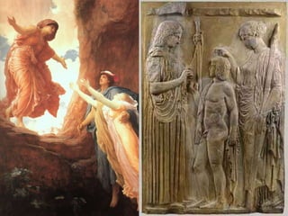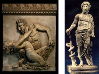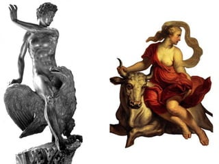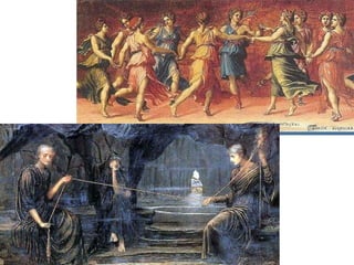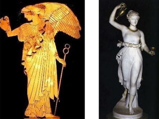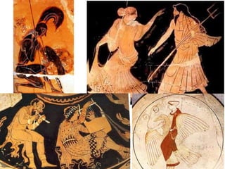 El documento resume las principales deidades de la mitología griega, incluyendo dioses olímpicos como Zeus, Poseidón, Hades, Hera, Deméter, Hestia y sus hijos Apolo, Artemis, Atenea, Ares, Afrodita, Hermes y Dioniso. También menciona divinidades menores como las Musas, las Gracias y las Horas. Finalmente, describe algunos héroes griegos notables como Heracles, Aquiles, Teseo, Jasón, Edipo y Perseo y sus hazañas más importantes.
