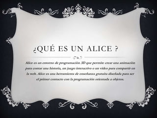 Alice es un entorno de programación 3D gratuito diseñado para introducir a los estudiantes en la programación orientada a objetos, permitiéndoles crear animaciones, juegos interactivos o videos para compartir en la web sin tener que lidiar con problemas complejos de programación. Está diseñado específicamente con fines educativos y vinculado a su entorno de desarrollo integrado propio.