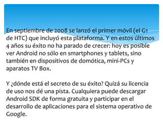 Android comenzó su desarrollo en 2003 por la empresa Android Inc. en Palo Alto, California. Google adquirió Android Inc. en 2005 y lanzó Android como un sistema operativo de código abierto para dispositivos móviles a finales de 2007. El primer teléfono con Android, el HTC Dream, se lanzó en 2008 y desde entonces Android ha experimentado un gran crecimiento, funcionando ahora no solo en teléfonos y tabletas sino también en dispositivos para el hogar, mini PCs y cajas para TV.
