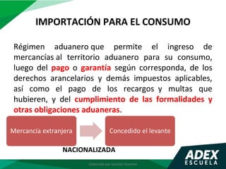 El documento describe el régimen de importación para el consumo en Perú. Este régimen permite la importación de mercancías al territorio aduanero para su consumo luego del pago de aranceles, impuestos y otros requisitos. Las mercancías importadas bajo este régimen se consideran nacionalizadas y están sujetas a la legislación peruana.