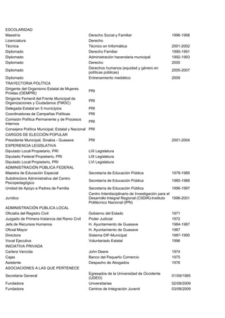 Este documento presenta el perfil político y académico de Diva Hadamira Gastélum Bajo, diputada federal por el estado de Sinaloa por el Partido Revolucionario Institucional. Resume su trayectoria como dirigente del PRI a nivel estatal y municipal, presidenta municipal de Guasave, Sinaloa, y experiencia legislativa como diputada local y federal. También incluye su formación académica en derecho y administración pública, así como cargos y experiencias laborales previos a su carrera política.