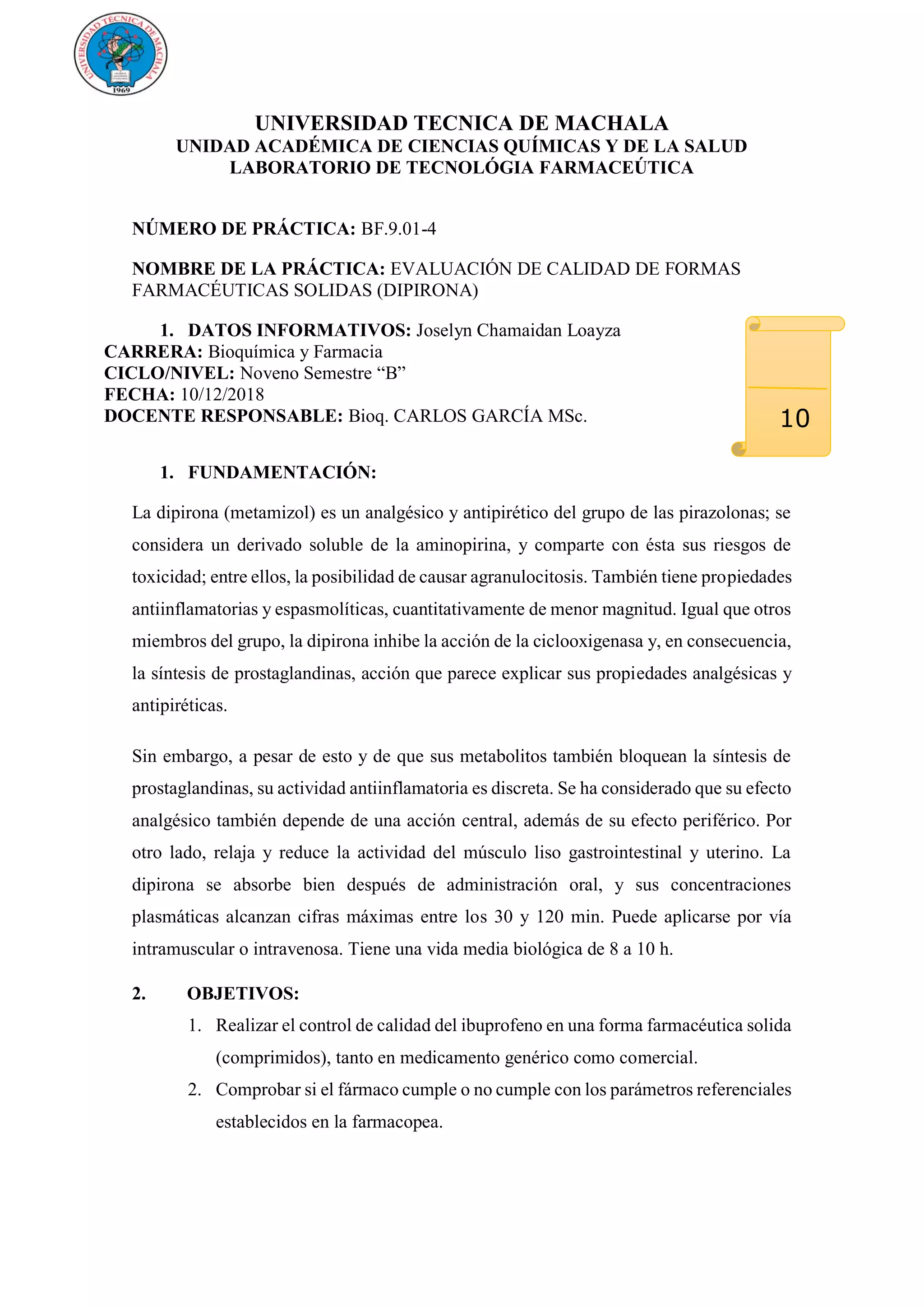 Este documento describe los procedimientos para evaluar la calidad de comprimidos de dipirona a través de varias pruebas, incluido el color, tamaño, pH, pérdida por secado, disolución y valoración. Los resultados muestran que los comprimidos cumplen con los estándares de la farmacopea para la dipirona en términos de pH, pérdida de peso, tiempo de disolución y porcentaje de principio activo. Por lo tanto, la dipirona cumple con los requisitos establecidos y es apta