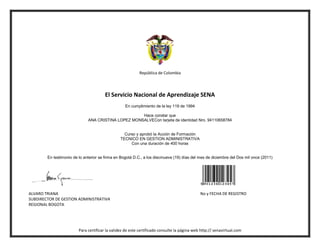 El documento es un certificado emitido por el Servicio Nacional de Aprendizaje (SENA) de Colombia a varios estudiantes que completaron con éxito un curso de 400 horas como Técnico en Gestión Administrativa en diciembre de 2011 en Bogotá. El certificado hace constar el nombre y número de identificación de cada estudiante y está firmado por el Subdirector de Gestión Administrativa Regional de Bogotá.