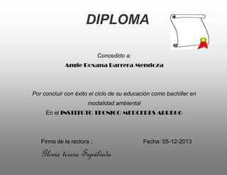 Este diploma certifica que Angie Roxana Barrera Mendoza completó con éxito sus estudios de bachillerato en modalidad ambiental en el Instituto Técnico Mercedes Abrego el 5 de diciembre de 2013, como se indica por la firma de la rectora Gloria Teresa Sepúlveda en el documento.