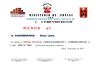 Este documento otorga a Susanibar Rios el primer puesto en el primer año A del 2012 en la Unidad de Gestión Educativa Local No 02 E. No 2029 "Simón Bolívar" por su aprovechamiento y comportamiento en la educación secundaria. El director Justo Pastor Chirinos Alarcón, el subdirector Alfonso Candiotti Morales y la tutora Pilar Díaz Cabrera firman el documento el 10 de enero de 2013 reconociendo el mérito de Susanibar Rios.