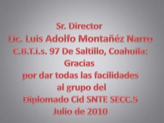 Este documento presenta el programa de un diplomado sobre el desarrollo de competencias en el uso de las TIC y su impacto en proyectos de nivel básico. Incluye la lista del personal directivo del centro y el equipo 1, que cubrirá temas como la historia de la computadora, hardware y software, sistemas operativos de Microsoft Windows, funciones de Windows XP, y conceptos básicos de hardware, software y Microsoft Office. El documento agradece al director y personal del laboratorio por su apoyo al diplomado.