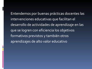 El documento describe las buenas prácticas docentes, las cuales facilitan el aprendizaje de los estudiantes de manera eficiente. Explica que estas prácticas incluyen tres fases: preactiva, intervención docente y postactiva. Además, detalla diversas metodologías de trabajo como exposiciones, debates y proyectos, y factores que facilitan la realización de buenas prácticas como las características de los estudiantes, profesores y centro educativo.