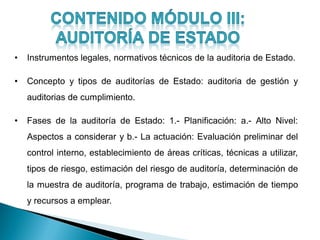 El documento presenta el cronograma y contenido de un curso de auditoría de Estado que incluye discusiones sobre los instrumentos legales y normativos de la auditoría, los conceptos y tipos de auditoría, y las fases de la auditoría de Estado incluyendo la planificación, ejecución, comunicación de resultados y seguimiento. También cubre temas como papeles de trabajo, informes y verificación de actas de entrega.