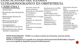 Este documento proporciona indicaciones y protocolos para realizar ultrasonografías obstétricas. Resume los objetivos del examen ultrasónico en obstetricia, incluyendo estimación de la edad gestacional, evaluación del crecimiento fetal, determinación de la presentación fetal, detección de anomalías y seguimiento del embarazo. Explica los tipos de ecografía, requisitos, biometría fetal, anatomía fetal normal y anormalidades que se pueden detectar. Además, brinda detalles sobre ecografía transvaginal en el primer trimestre y desar