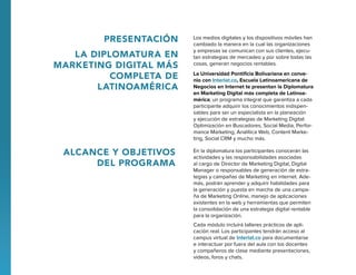 La Diplomatura en Marketing Digital de CMLatam.co, en colaboración con la Universidad Pontificia Bolivariana e Interlat.co, ofrece un programa de 120 horas que abarca diversas áreas del marketing digital, incluyendo SEO, social media, analítica web, y más, para capacitar a los participantes como especialistas en el campo. Está dirigida a profesionales de comunicación, publicidad y mercadeo, e incluye metodología presencial y virtual, talleres prácticos y acceso a un campus virtual. Al finalizar, los asistentes obtendrán una certificación al cumplir con los requisitos establecidos.
