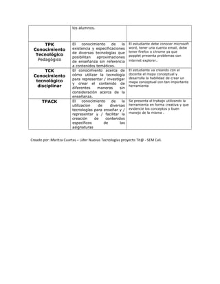 Este documento presenta una matriz con los componentes del marco TPACK (Conocimiento Tecnológico Pedagógico del Contenido) y sus definiciones. Explica cómo usar la herramienta Popplet para crear mapas conceptuales que ayuden a los estudiantes a organizar y fijar el conocimiento sobre los géneros literarios. También describe cómo el estudiante y el docente pueden trabajar juntos para crear un mapa conceptual sobre los géneros narrativo, lírico y dramático usando Popplet.