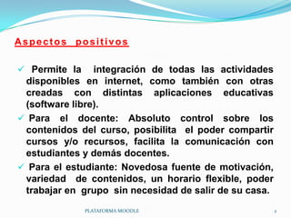Moodle es un software gratuito y fácil de instalar que facilita la creación y gestión de cursos en línea. Ofrece varias ventajas como la comunicación a distancia, actividades formativas individuales y colaborativas, y control total para docentes sobre los contenidos del curso. Algunos posibles inconvenientes son la falta de interacción personal, la posible adicción a Internet, y que las actividades podrían volverse mecánicas sin profundidad si no están bien diseñadas.