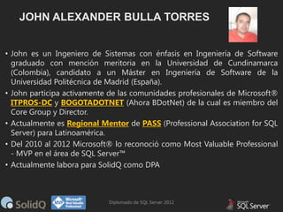 El documento presenta un diplomado sobre las nuevas herramientas de desarrollo en SQL Server 2012. Introduce a John Alexander Bulla Torres, instructor del curso, y describe las nuevas características de SQL Server Data Tools como el desarrollo de bases de datos conectado y desconectado, la integración mejorada entre aplicaciones y bases de datos, y la publicación simplificada de esquemas de bases de datos.