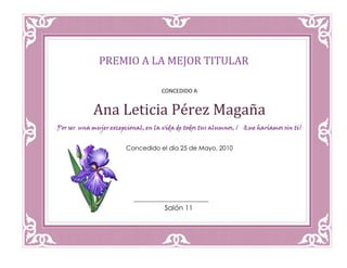 Un diploma otorgado a Ana Leticia Pérez Magaña por su excelente labor como titular en el Bachillerato Cervantes Loma Bonita. El diploma reconoce su dedicación y el impacto positivo en la vida de sus alumnos. Fue concedido el 25 de mayo de 2010.