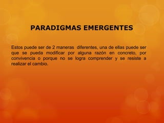Este documento discute varios paradigmas emergentes en la investigación social, incluyendo los paradigmas de la complejidad, los sistemas y el holismo. Explica que los paradigmas emergentes buscan entender el conocimiento como un diálogo entre sujeto y objeto en lugar de una visión positivista. También describe cómo la teoría general de sistemas analiza los sistemas y subsistemas y sus interrelaciones, y cómo la teoría de la complejidad enfatiza el pensamiento relacional. Finalmente, resume que la teoría del holismo