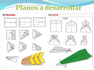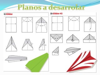 El documento trata sobre la enseñanza de la elaboración de aviones de papel a niños de primaria. Los objetivos son que los niños aprendan a manejar su tiempo libre de forma creativa y desarrollen su mente y creatividad, y que al final del taller sepan elaborar 2 o más aviones de papel por sí mismos. También busca familiarizar a los niños con conceptos de física y matemáticas que verán más adelante.