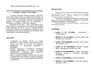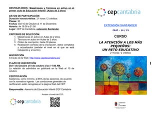 Este documento describe un curso de formación para maestros y técnicos que trabajan en aulas de educación infantil para niños de 2 años. El curso dura 21 horas repartidas entre octubre y diciembre, con ponencias y discusiones sobre temas relacionados con la atención a los más pequeños. El curso tiene como objetivos fundamentar la práctica docente en edades tempranas y crear un espacio para el debate y la reflexión sobre estrategias pedagógicas de calidad.