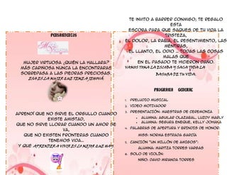 Este documento presenta el programa para un taller psicológico sobre el perdón. El taller será impartido por la psicóloga Elder Calderón Calderón y contará con presentaciones musicales, dinámicas grupales, y entrega de recuerdos y sorpresas a las asistentes. El objetivo del taller es enseñar a las participantes sobre la importancia del perdón y cómo este puede ayudar a limpiar la basura emocional del pasado.
