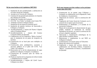 Este documento presenta las obras y proyectos realizados en la legislatura 2007-2011 en las localidades de Collejares y Cortijuelo, así como los planes previstos para 2011-2015. Entre las obras pasadas se incluyen la instalación de aire acondicionado en el Centro Social de Cortijuelo y el asfaltado de la carretera Collejares-Huesa. Los planes futuros son la construcción de un puente entre las dos localidades y la ampliación del Centro Social de Cortijuelo con un espacio para jóvenes.