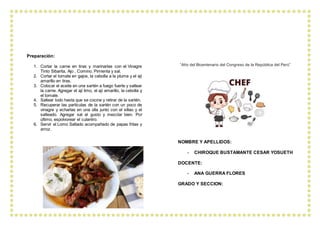 El documento presenta la receta de un plato típico peruano llamado Lomo Saltado. Los ingredientes incluyen lomo, ají limo, cebolla roja, tomate, ají amarillo, sillao, culantro, vinagre tinto y papas fritas. La preparación implica marinar la carne con vinagre y especias, saltear la carne y vegetales hasta que se cocinen, y servir el platillo acompañado de papas fritas y arroz.