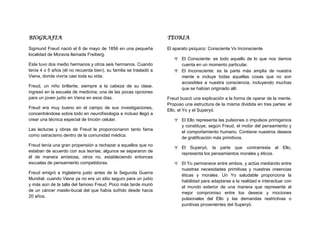 Sigmund Freud innovó en el desarrollo de la teoría de la mente y la conducta humana, proponiendo que la mente está dividida en el Ello, el Yo y el Superyo. Creó también la técnica del psicoanálisis para ayudar a personas con problemas psíquicos. Explicó que la libido se desarrolla en etapas como la oral y la fálica, y que lo inconsciente juega un papel importante en la personalidad y los sueños. Publicó obras influyentes como La interpretación de los sueños.