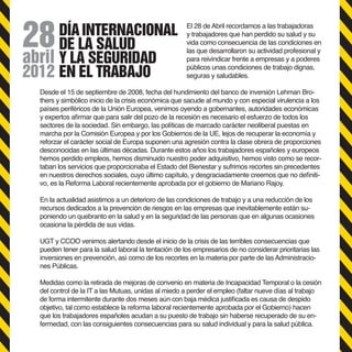 El documento habla sobre el Día Internacional de la Salud y la Seguridad en el Trabajo. Señala que las políticas neoliberales en Europa han reducido los derechos de los trabajadores y empeorado sus condiciones laborales, poniendo en riesgo su salud y seguridad. También menciona el aumento de enfermedades profesionales y accidentes de trabajo. Finalmente, llama a la movilización el 28 de abril para exigir trabajos dignos y seguros.