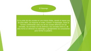 El documento define el diptongo como la unión de dos vocales en una misma sílaba, donde al menos una es débil. Explica que existen 14 diptongos formados por combinar vocales abiertas y cerradas de diferentes formas. Además, clasifica los diptongos en crecientes o ascendentes, formados por una vocal débil y luego una fuerte, y decrecientes o descendentes, formados por una vocal fuerte seguida de una débil.