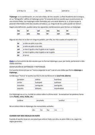 Este documento describe los conceptos de diptongo, triptongo e hiato en español. Un diptongo es la combinación de dos vocales en una sola sílaba, como "ai" o "ie". Un triptongo combina tres vocales en una sílaba, como "iai". Un hiato ocurre cuando dos vocales están en sílabas separadas, como en "peón". El documento explica las reglas de acentuación para diptongos, triptongos y hiatos.