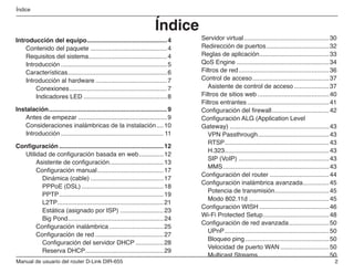 Este manual describe las características y funcionalidades del router inalámbrico D-Link DIR-655. El router soporta la tecnología 802.11n para proporcionar una conexión inalámbrica rápida de hasta 300 Mbps. Incluye funciones de seguridad como WPA y WEP para proteger la red, así como un cortafuegos dual activo. El manual explica cómo configurar e instalar el router, así como temas sobre seguridad inalámbrica, solución de problemas y especificaciones técnicas.