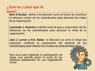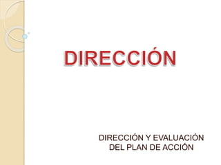 Este documento describe los conceptos clave de la dirección y evaluación de un plan de acción, incluyendo la definición de dirección, los principios y procesos de dirección, la toma de decisiones, la motivación, teorías de motivación, comunicación, liderazgo y el perfil de un líder.