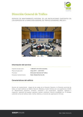 Este documento resume un contrato de mantenimiento integral de las instalaciones de la Dirección General de Tráfico en Madrid entre 2011 y 2015. Soler Global Service SL se encargó del mantenimiento de 9 edificios con una superficie total de 60.000 m2 por un importe de 1.588.027,19 euros. El mantenimiento incluía tareas preventivas, correctivas, de conservación, regulación, vigilancia, inspección y reparación de equipos así como jardinería, cubriendo turnos las 24 horas del día los 7 días de la semana.
