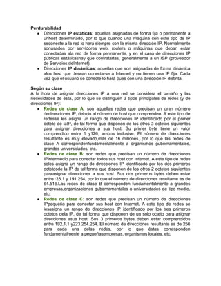 Una dirección IP consiste en 32 bits expresados como cuatro grupos de números entre 0-255 separados por puntos. Existen direcciones públicas visibles desde Internet y privadas sólo visibles internamente. Las direcciones pueden ser estáticas asignadas de forma permanente o dinámicas cambiando cada vez que se conecta un dispositivo. Las direcciones también se clasifican en clases A, B o C dependiendo del tamaño de la red y número de dispositivos que necesita conectar.