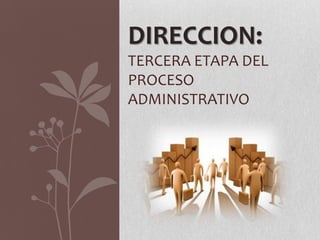 Este documento describe los conceptos clave de la dirección como la tercera función administrativa. Explica que la dirección se relaciona con guiar a los recursos humanos para alcanzar los objetivos organizacionales y debe incluir orientar y motivar el comportamiento de los subordinados. También resume los tipos de dirección, características como la unidad de mando, y la importancia de la delegación para una organización lógica y eficiente.