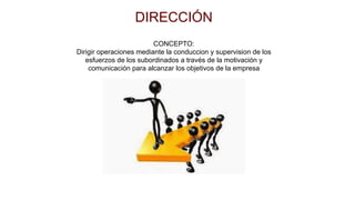 El documento describe los principales conceptos y procesos relacionados con la dirección de una empresa. Explica que la dirección implica motivar y comunicarse con los subordinados para alcanzar los objetivos de la empresa. También describe los principios básicos de la dirección como la coordinación de intereses, la supervisión directa y la resolución de conflictos. Además, explica los procesos de toma de decisiones, integración, motivación, comunicación, autoridad, delegación y liderazgo que son fundamentales para la dirección de una organización.
