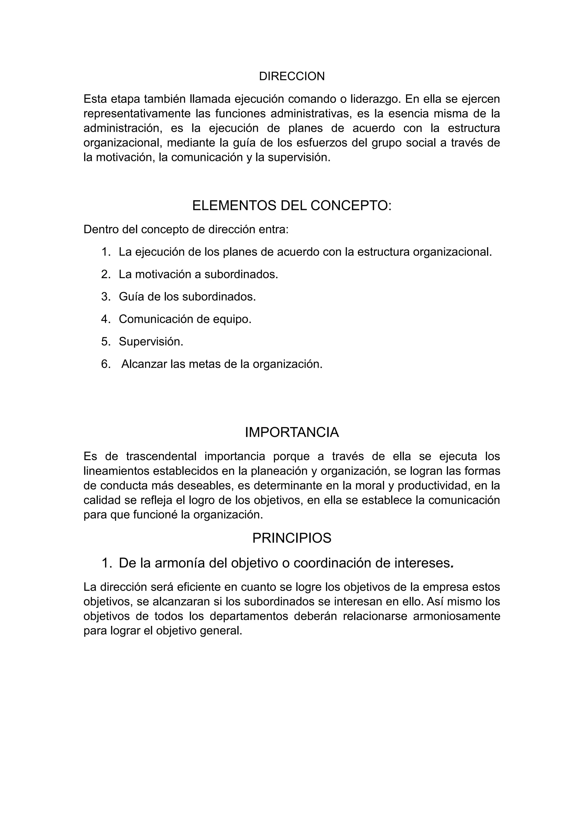 La dirección implica la ejecución de planes y estrategias de acuerdo a la estructura organizacional mediante la motivación, comunicación y supervisión de los esfuerzos del grupo. Incluye tomar decisiones, integrar recursos humanos y materiales, y motivar al personal para alcanzar las metas organizacionales. Es crucial para implementar la planeación y lograr resultados, productividad y el cumplimiento de objetivos.