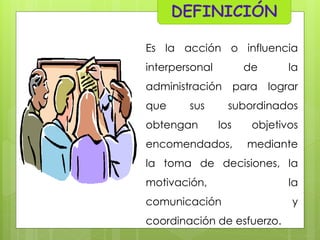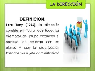 El documento define la dirección como la acción o influencia interpersonal de la administración para lograr que sus subordinados obtengan los objetivos encomendados, mediante la toma de decisiones, la motivación, la comunicación y la coordinación de esfuerzos. Según Terry, la dirección consiste en lograr que todos los miembros del grupo alcancen el objetivo de acuerdo con los planes y la organización trazados por el jefe administrativo. El documento también resume los principios de la dirección propuestos por Fayol, Koontz y O'Donnell, y Terry