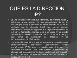 La dirección IP identifica de manera lógica una interfaz de una computadora dentro de una red que utilice el protocolo IP. Existen direcciones IP dinámicas que pueden cambiar varias veces al día y direcciones IP estáticas que no cambian con el tiempo y son necesarias para sitios que requieren estar permanentemente conectados como servidores. El DNS traduce nombres de dominio legibles para humanos en identificadores binarios como direcciones IP para poder localizar equipos en la red globalmente.
