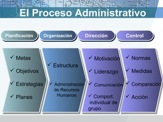 El documento describe los conceptos clave del proceso administrativo de dirección y control. La dirección implica conducir y guiar a los subordinados para ejecutar planes y lograr objetivos mediante la motivación, comunicación y supervisión. El control compara los resultados con los planes y establece medidas para sugerir acciones correctivas que ayuden a alcanzar las metas.