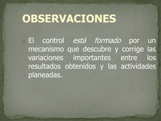 El documento define el control como la medición y evaluación del desempeño para determinar si se ajusta a los planes y aplicar medidas correctivas de ser necesario. Explica que el proceso de control implica establecer estándares, medir el desempeño, compararlo con los estándares y aplicar acciones correctivas cuando haya desviaciones. También menciona diferentes tipos de control a nivel táctico y operacional así como herramientas para mejorar la productividad.