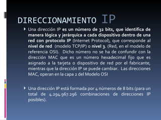 Una dirección IP identifica de manera lógica a cada dispositivo en una red. Está formada por 32 bits divididos en 4 octetos y permite más de 4 mil millones de combinaciones. Las direcciones se clasifican en A, B y C según el tamaño de la red, y existen direcciones reservadas como 127.0.0.1 para bucles locales. La máscara de red divide grandes redes en subredes más pequeñas.