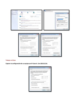 Este documento describe las direcciones IP de clase A, las cuales son utilizadas por grandes empresas que proveen servicios de internet. Estas direcciones tienen 126 redes posibles y cada red puede tener hasta 16.7 millones de hosts. El documento también incluye un ejercicio de aplicación donde se diseña una red con topología de anillo usando direcciones IP clase A.