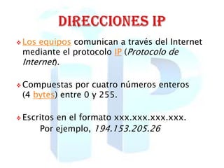 Este documento explica las direcciones IP, incluyendo que están compuestas por cuatro números entre 0-255 separados por puntos, y que identifican redes y equipos. Describe las clases A, B y C de direcciones IP, las cuales varían en la cantidad de redes posibles y equipos máximos por red. La clase A permite menos redes pero más equipos por red, mientras la clase C permite más redes pero menos equipos por red.