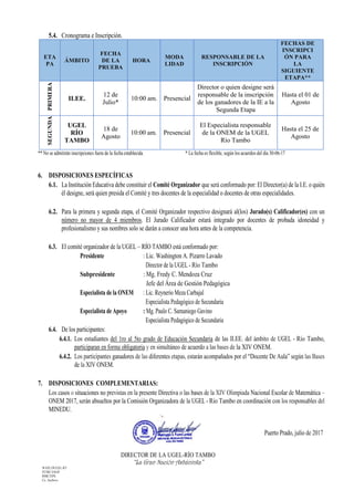 Esta directiva establece las normas para organizar y ejecutar la XIV Olimpiada Nacional Escolar de Matemática en 2017 en las instituciones educativas de educación secundaria en Río Tambo. Se crearán comités organizadores en cada institución y en la UGEL para coordinar las distintas etapas de la olimpiada a nivel local y regional. La olimpiada tendrá como objetivo estimular el interés de los estudiantes por las matemáticas y mejorar sus logros de aprendizaje.