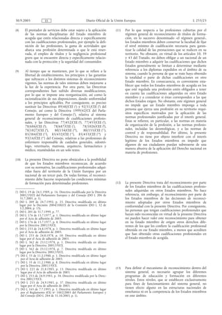La Directiva 2005/36/CE del Parlamento Europeo y del Consejo establece normas para el reconocimiento de las cualificaciones profesionales adquiridas en un estado miembro, facilitando así la libre circulación de profesionales en la Unión Europea. La directiva permite que los profesionales ejercen su actividad en otros estados miembros bajo principios de equivalencia, mientras que se respetan las normas y condiciones del país de acogida. También se menciona el establecimiento de un régimen general de reconocimiento de títulos y la posibilidad de que los estados miembros establezcan requisitos específicos justificados.