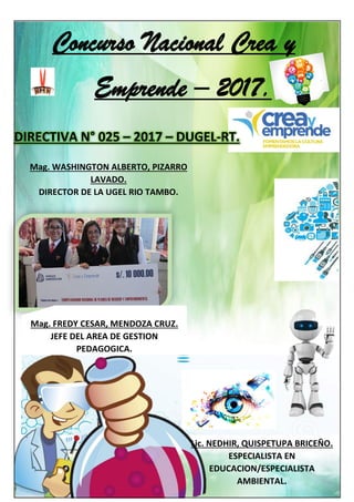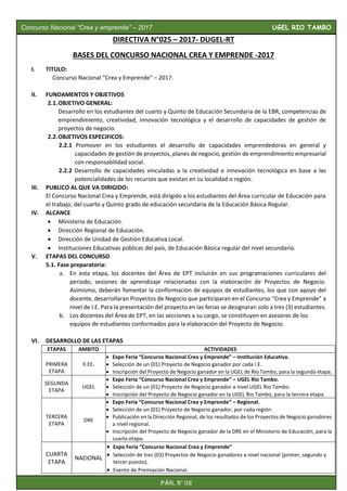 Este documento establece las bases para el Concurso Nacional "Crea y Emprende" de 2017. El concurso busca promover la creatividad, emprendimiento e innovación tecnológica entre estudiantes de cuarto y quinto grado de secundaria. Se desarrollará en 4 etapas a nivel de instituciones educativas, UGEL, región y nacional. Los estudiantes presentarán proyectos de negocio que serán evaluados por jurados. El proyecto ganador de cada etapa avanzará a la siguiente.