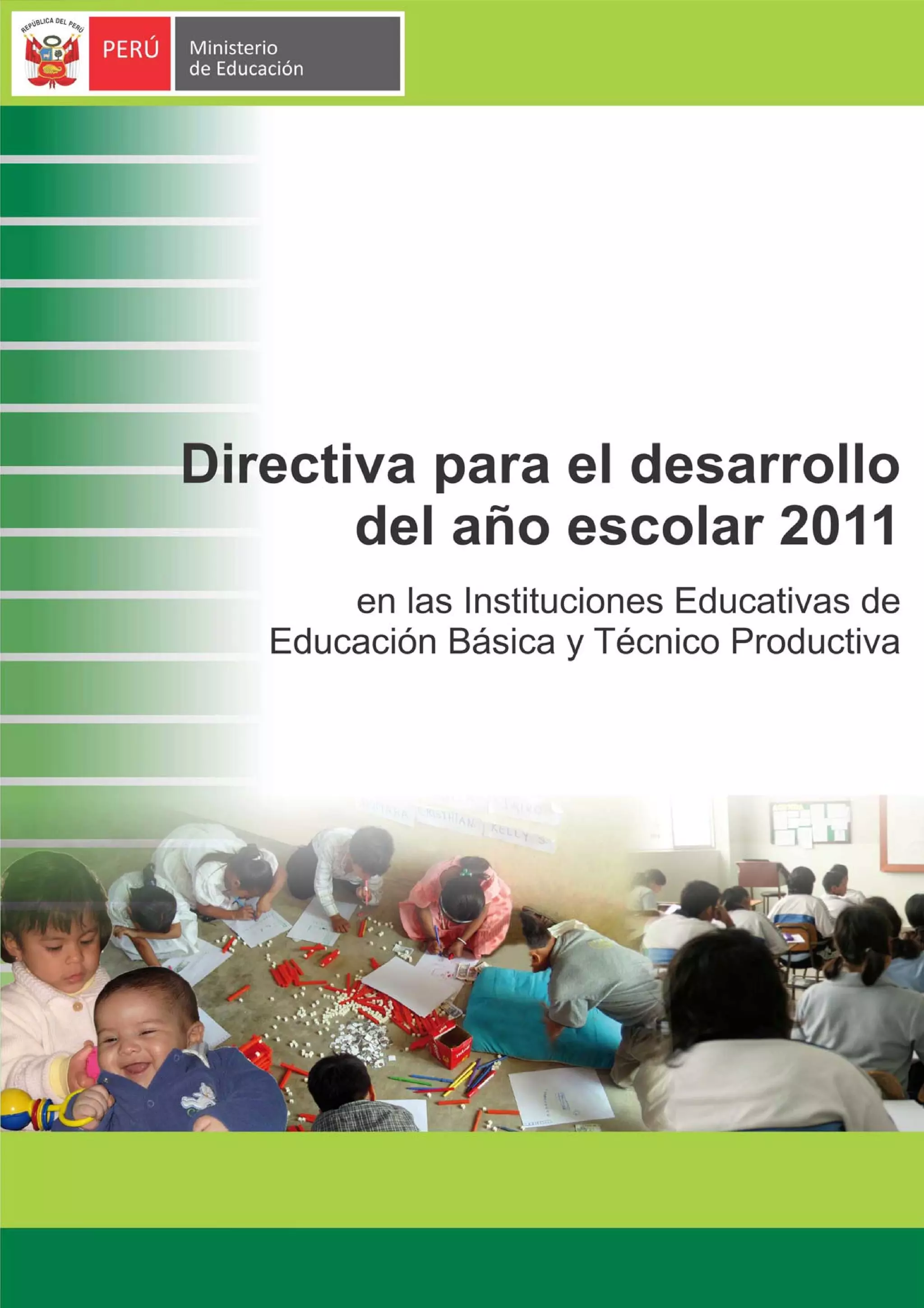 Este documento establece directivas para el desarrollo del año escolar 2011 en instituciones educativas de educación básica y técnico productiva. Incluye normas generales sobre planes educativos, diversificación curricular, uniformes escolares, capacitación docente y participación de padres de familia. También presenta normas transversales sobre interculturalidad, inclusión, tutoría, educación ambiental y uso de tecnología educativa. Finalmente, detalla normas específicas para la educación básica regular, básica especial, b
