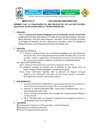 Este documento establece normas para la finalización del año escolar 2014 en instituciones educativas de educación básica y técnico productiva en la región de Puno, Perú. Define disposiciones generales como cumplir con al menos 40 semanas de trabajo pedagógico, realizar clausuras a partir del 22 de diciembre, y presentar informes a las Unidades de Gestión Educativa Local e informes consolidados a la Dirección Regional de Educación de Puno. También especifica requisitos para educación básica especial, inicial, pri