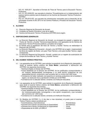 Este documento establece normas y procedimientos para la expedición, inscripción y registro de títulos de Técnico y Auxiliar Técnico otorgados por los Centros de Educación Técnico-Productiva en la región de Ancash, Perú. Describe los requisitos que los egresados deben cumplir para solicitar la expedición de sus títulos, incluyendo la aprobación de un examen teórico-práctico, así como los procedimientos que la Dirección Regional de Educación de Ancash debe seguir para expedir y