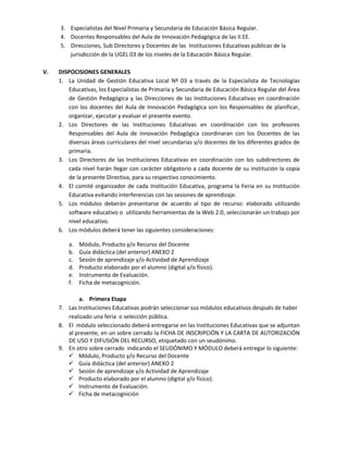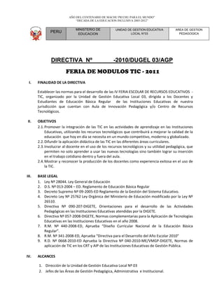 La directiva establece las normas para la IV Feria Escolar de Recursos Educativos con Tecnologías de la Información y Comunicación (TIC) organizada por la Unidad de Gestión Educativa Local 03. El objetivo es promover el uso de las TIC en las actividades de aprendizaje y difundir su aplicación didáctica en diferentes áreas. La feria seleccionará módulos educativos creados por docentes utilizando software, herramientas web y recursos tecnológicos como laptops y robótica, los cuales serán
