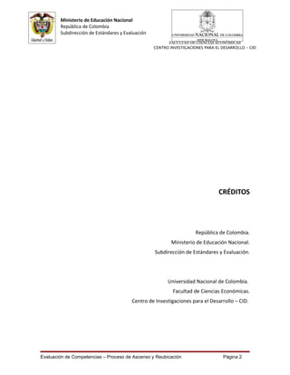 Este documento presenta la guía para la evaluación de competencias de directivos docentes en Colombia. Explica que la evaluación busca valorar el desarrollo profesional de los educadores y apoyar el mejoramiento continuo de la calidad educativa. Incluye marcos conceptuales de las competencias comportamentales, pedagógicas y disciplinares evaluadas para directivos docentes. Finalmente, detalla las funciones esperadas de los directivos docentes en ámbitos administrativo, pedagógico, de convivencia y compromiso social.